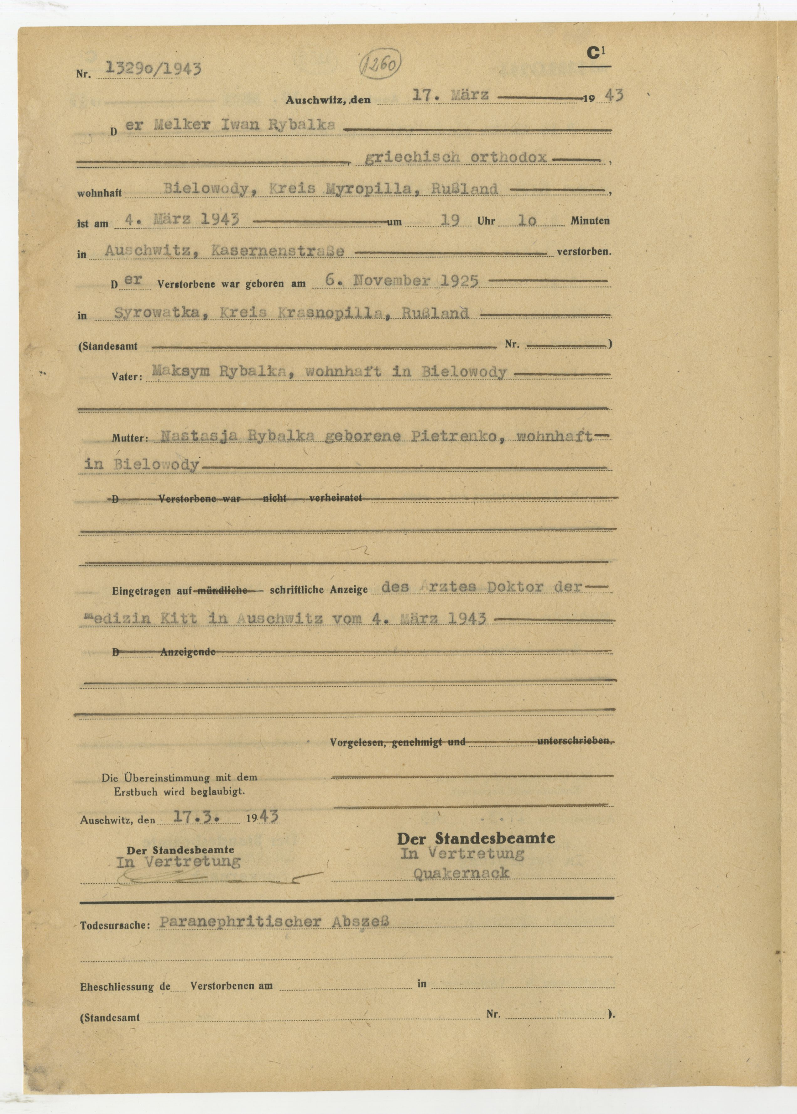 IWAN REBAŁKA was born on February 6, 1925, to Nastasja and, his father, Maksym Rybałka. At the time, the family lived in Syrowatka, Kreis Krasnopilla, Russland—an area which is now the sovereign territory of Ukraine. According to documents recovered from KL Auschwitz, Iwan belonged to the Greek Orthodox Church and was a milkman by trade when he was arrested in Bielowody, Kreis Myropilla, Russland.